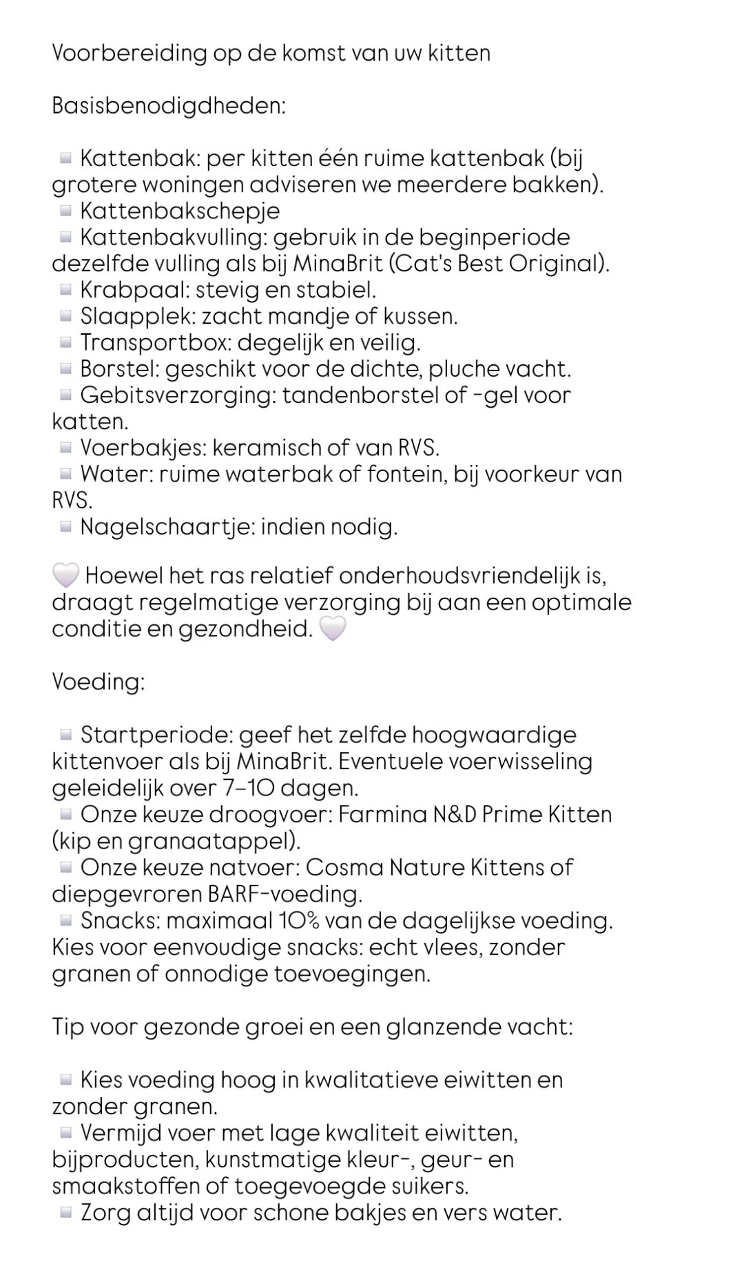 Advies en begeleiding zijn essentieel om toekomstige eigenaren te helpen de juiste keuzes te maken voor hun nieuwe kitten. We geven informatie over verzorging, voeding, socialisatie en gezondheid, zodat elk kitten een liefdevol en goed voorbereid thuis krijgt.